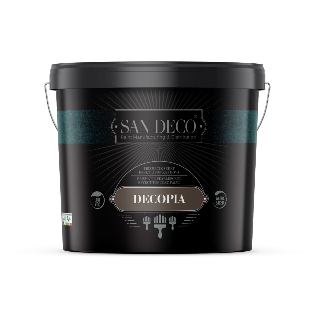 DECOPIA is an acrylic emulsion-based three-dimensional prismatic mother-of-pearl decorative protective interior top coat paint, which is a mixture of special glitter that gives a different color effect and shine compared to the light.