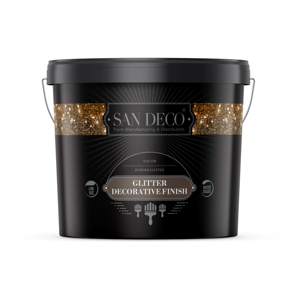 Decorative Finish Glitter is an acrylic emulsion-based topcoat paint designed for application on decorative paste, paint, and paste-like decorative products, imparting a shimmering silver finish.